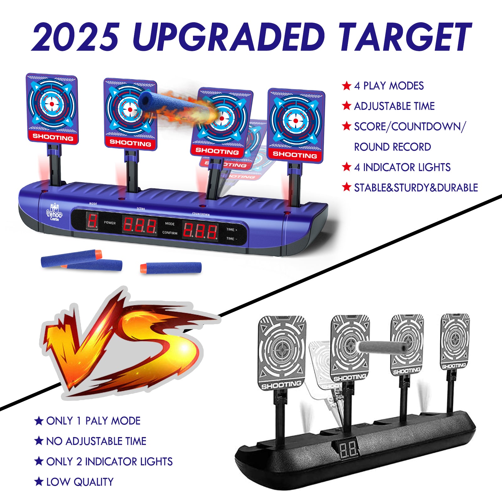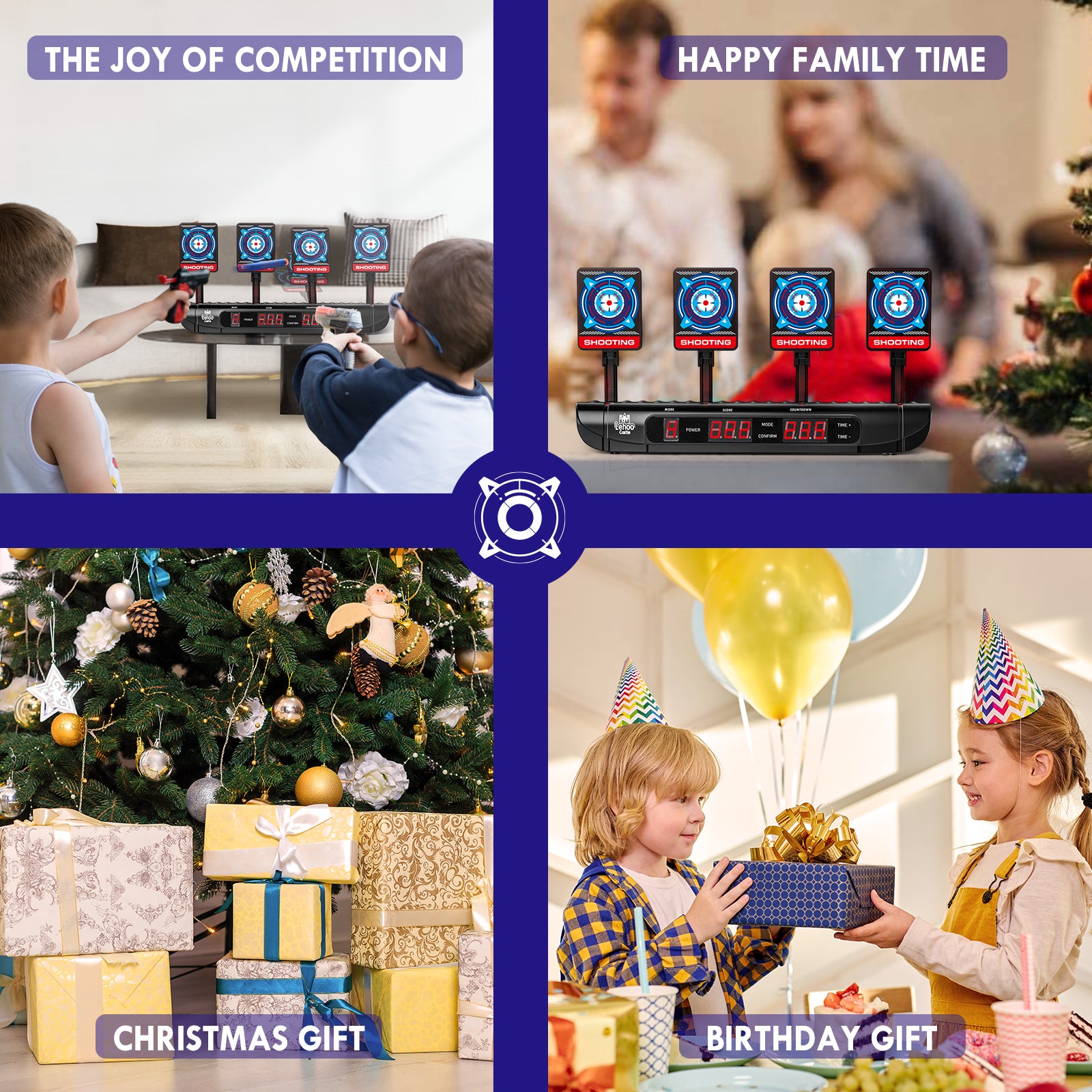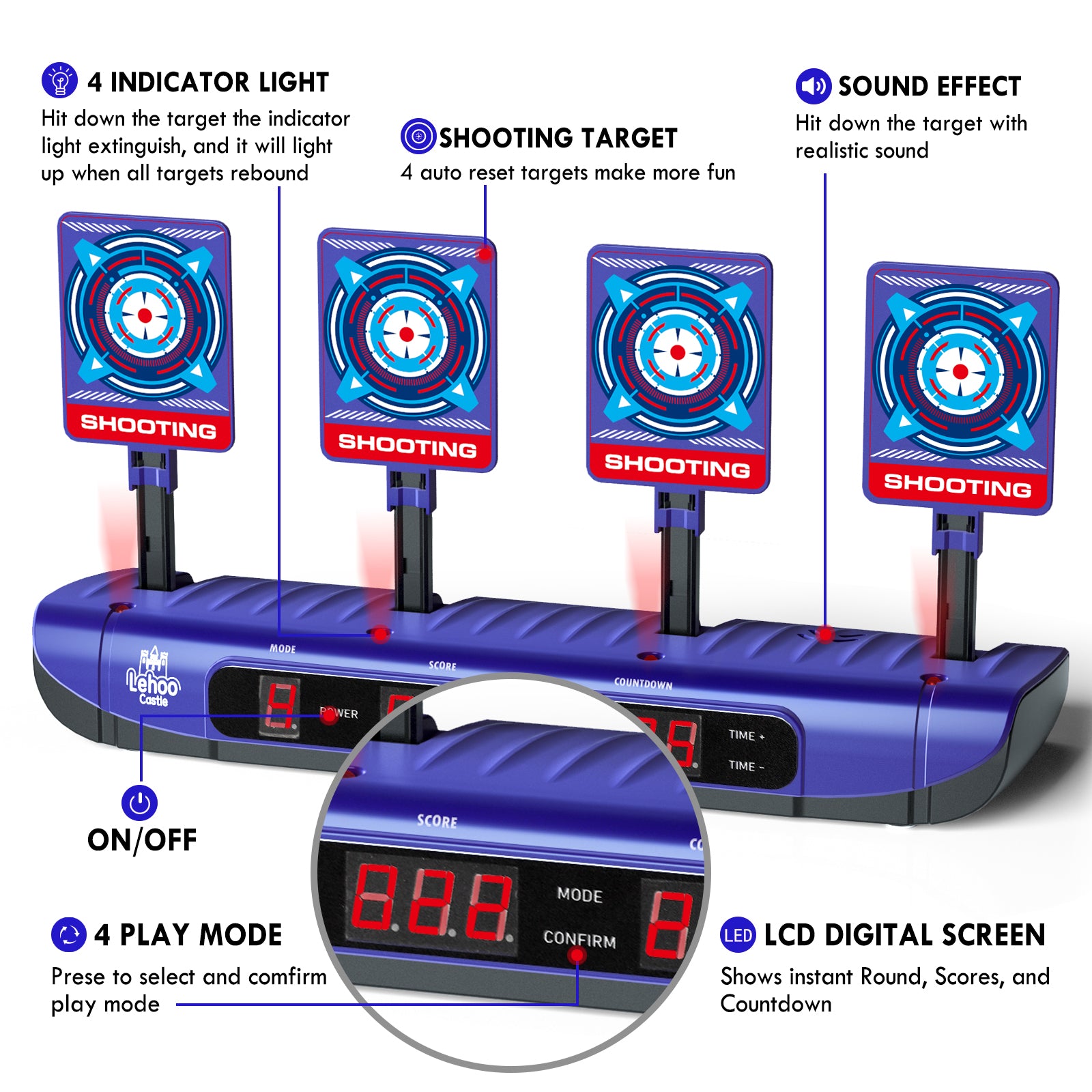 - 【WHY CHOOSE US?】: √Featuring with 4 targets while other brands are only 3 targets, brings kids more fun and challenge. √Equipped with 3 LCD screen which shows instant scores,rounds of game and countdown, giving more richer gaming experiences. √Auto reset system make all 4 targets rebound automatically after all fell, it will attract the children to continue shooting towards the targets. √Realistic sounds of shooting shots immersive enough to make kids feel like in a battlefield!