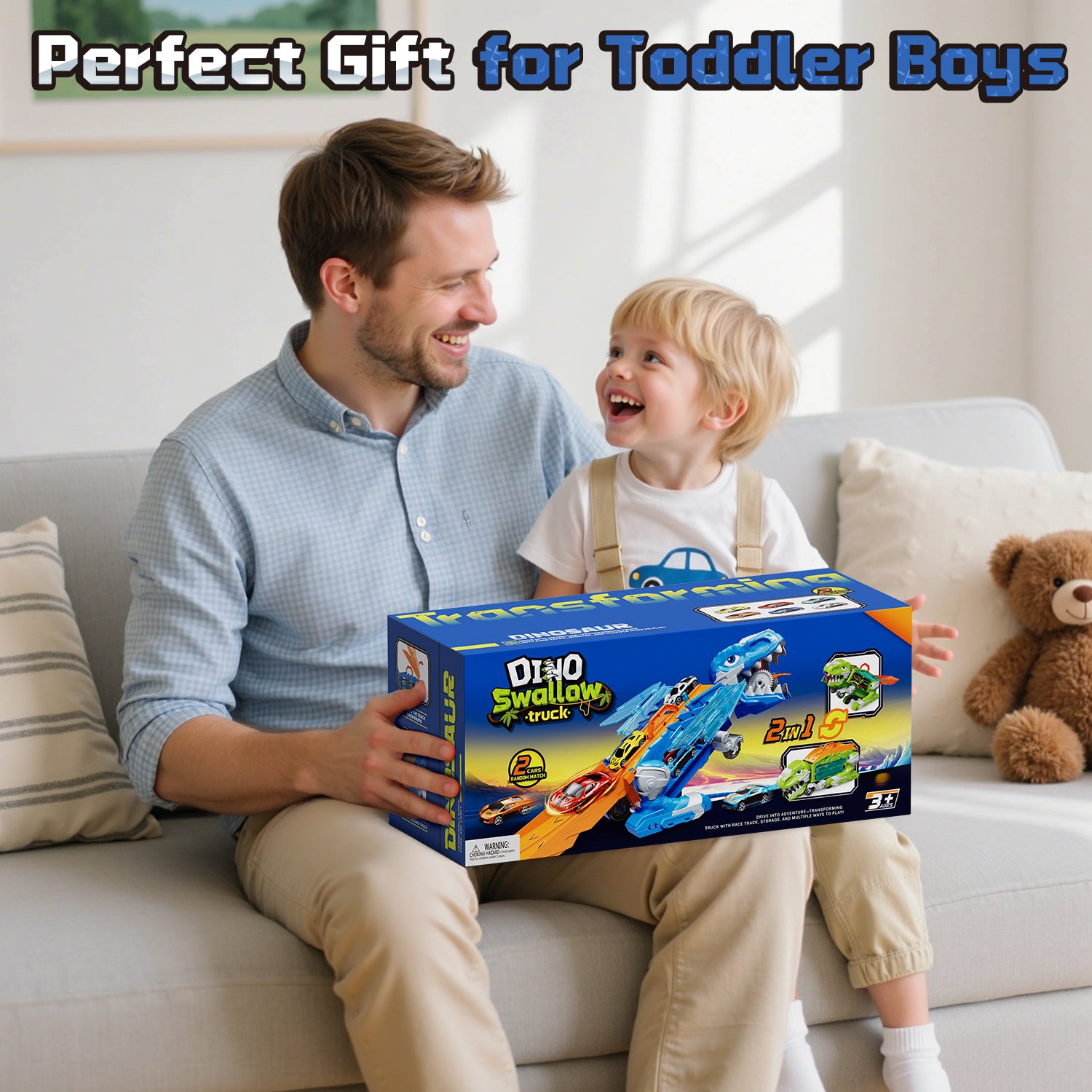 - Premium Quality Materials- The dino truck for boys & 8 track cars are non-fading, non-toxic, & smooth with a burr free surface to keep your kids soft hands safe while playing. The top handle makes it easy & safe for kids to carry.