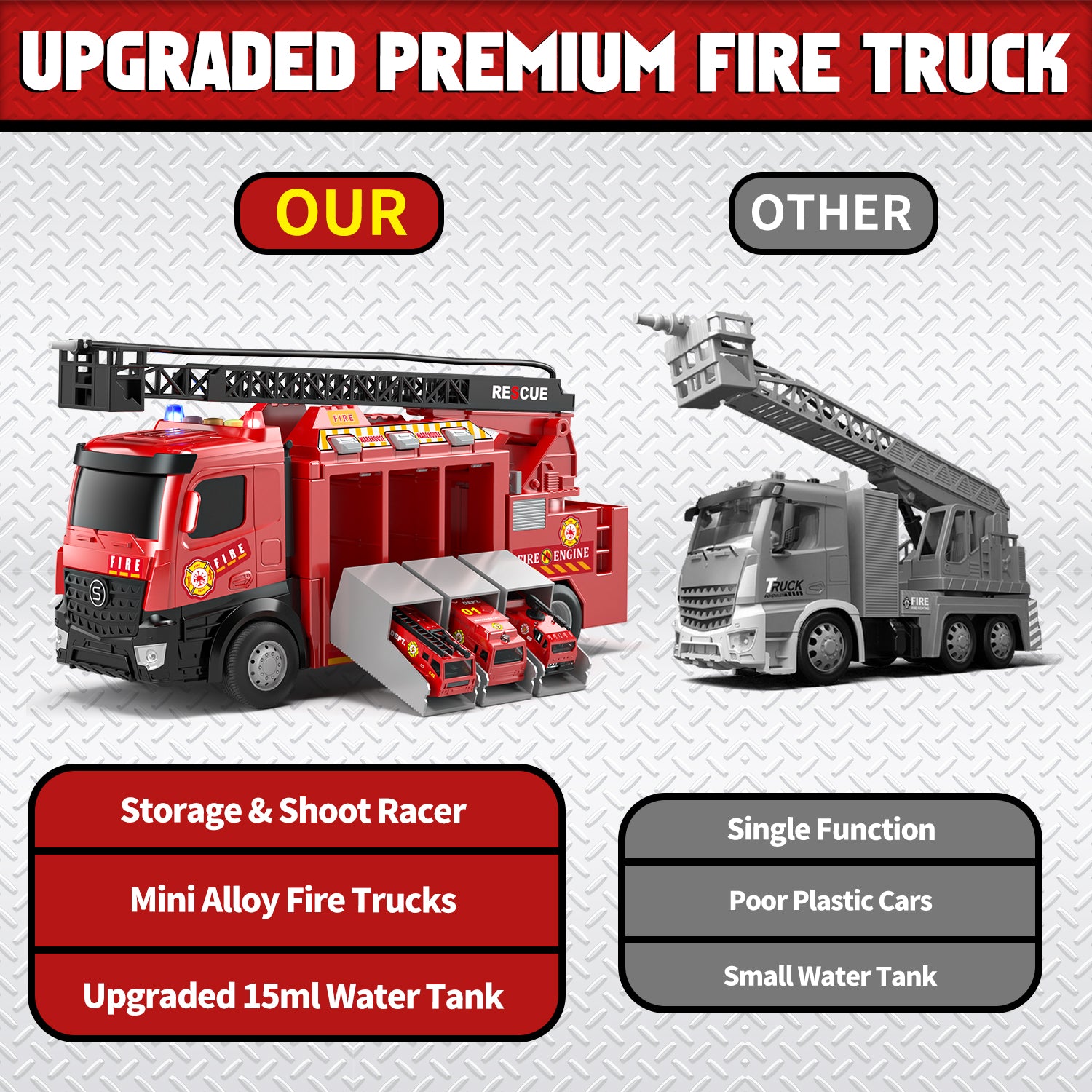 Realistic 18-Inch Telescopic Ladder: Equipped with an extendable ladder over 18 inches long, this fire truck toy lets kids simulate high-altitude rescues. The movable sprinkler can be mounted on the ladder, creating an authentic firefighting experience that sparks creativity and adventurous play.