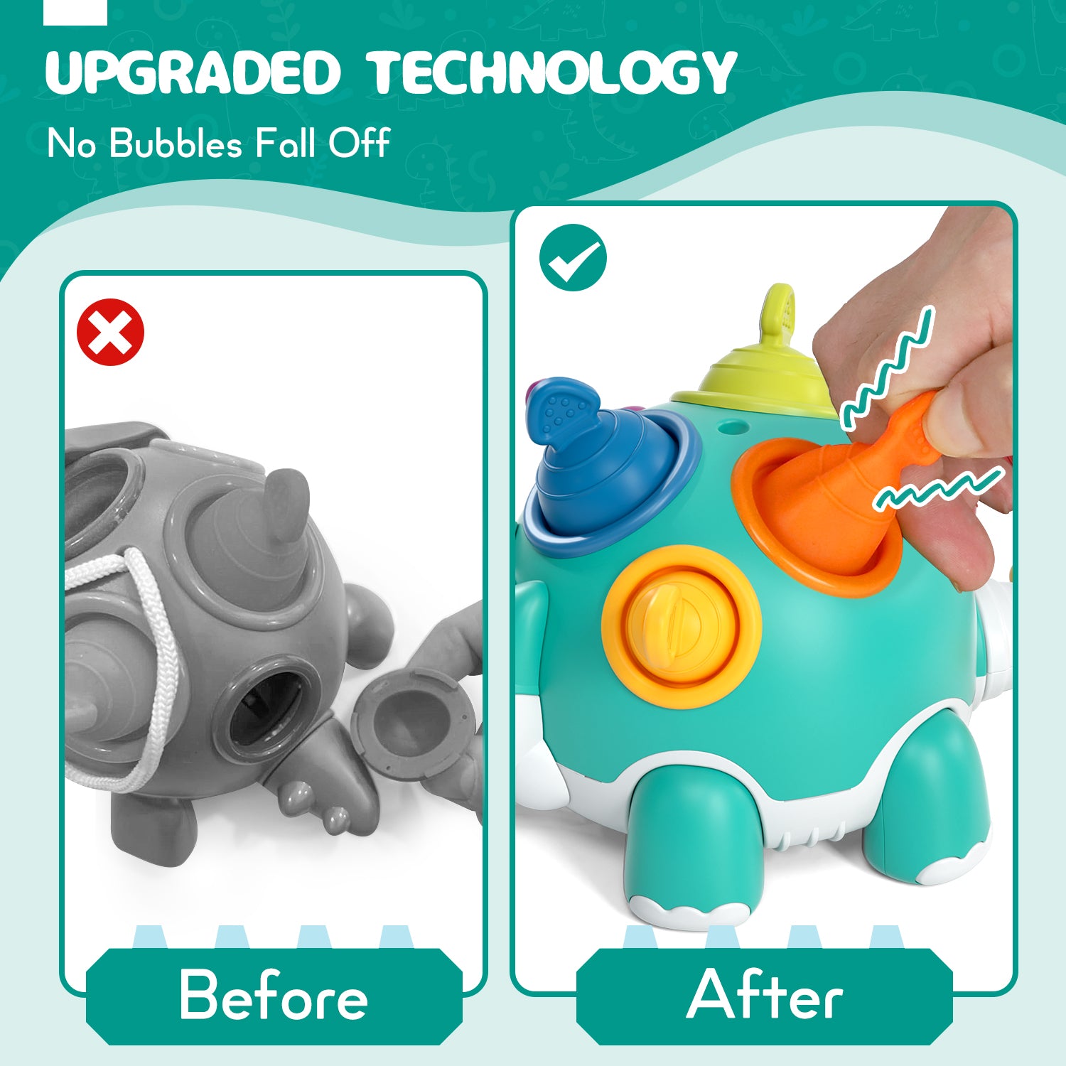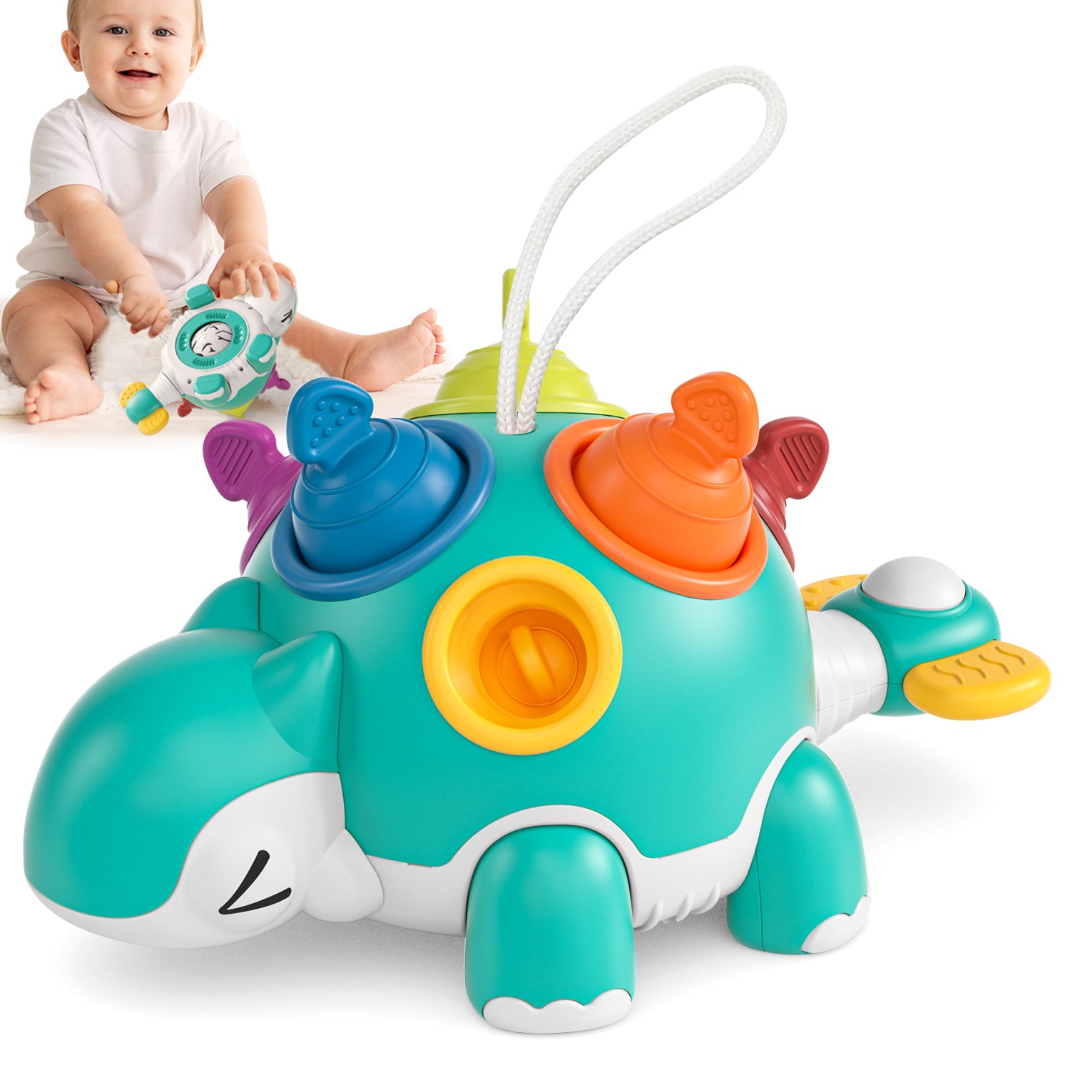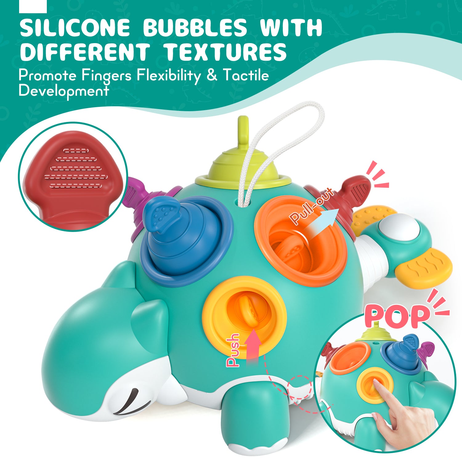 Sensory toy your baby should have! ✔Push in pop fidget and rotatable dinosaur egg, tail and chassis to exercise toddlers's fine motor skills and hand-eye coordination. ✔Stretchable legs adds a dynamic element, strengthening their grip and fostering gross motor skills. ✔Bubbles designed to mimic pacifiers can help babies develop chewing skills. ✔Colorful designs stimulate babies's vision and help them identify different colors. ✔Built-in bell sounds to capture baby's attention. Excellent developmental montessori learning toys for 1 year old boys and girls.