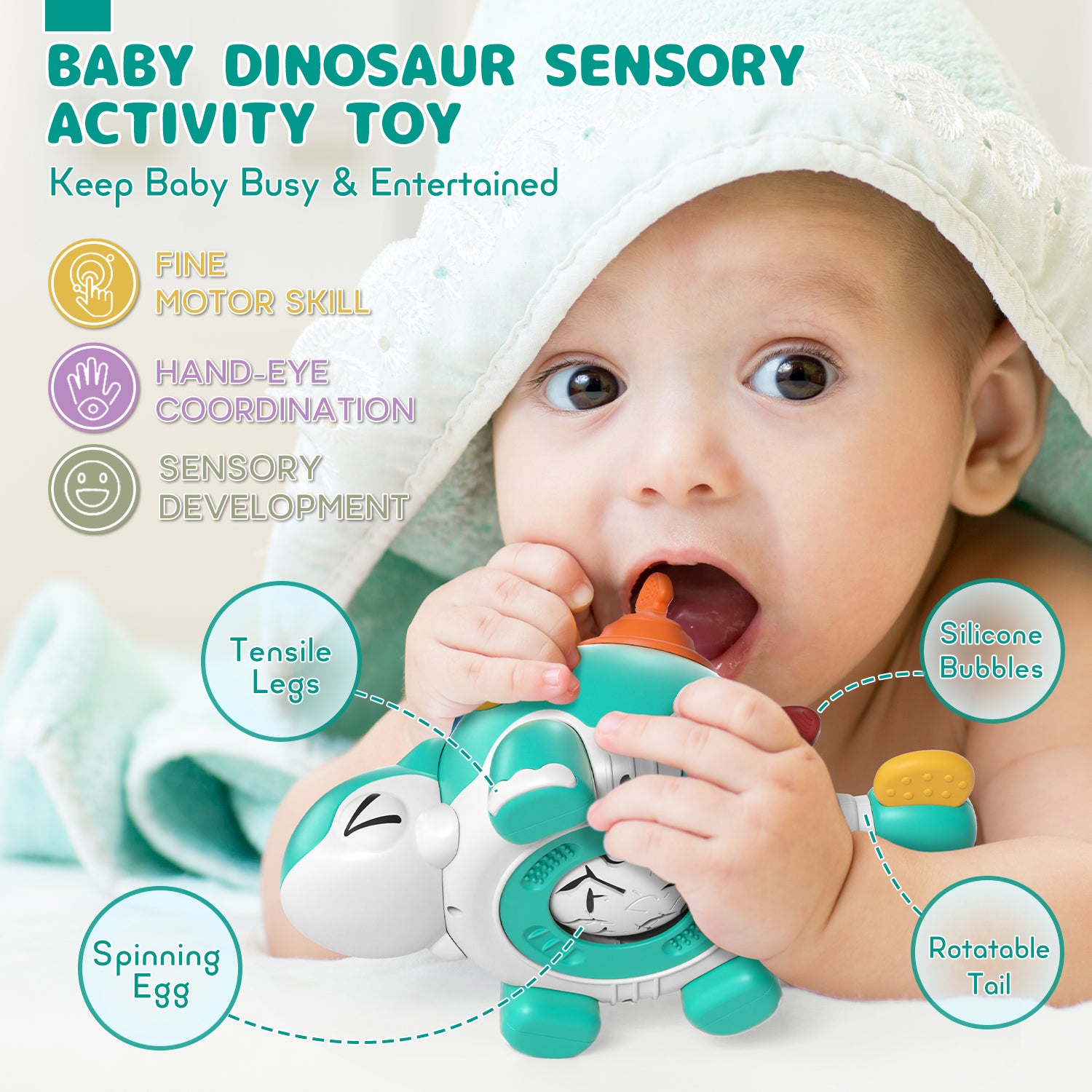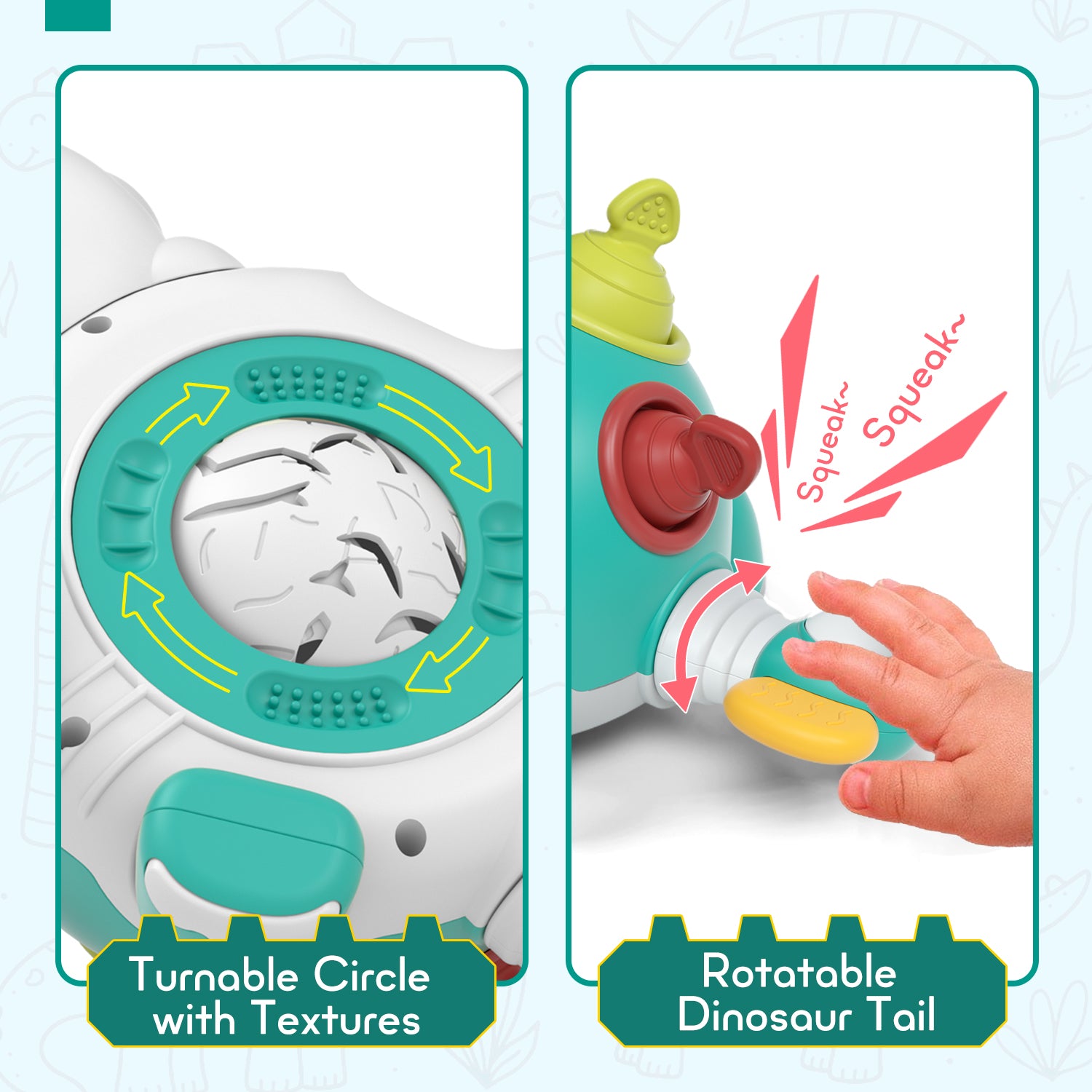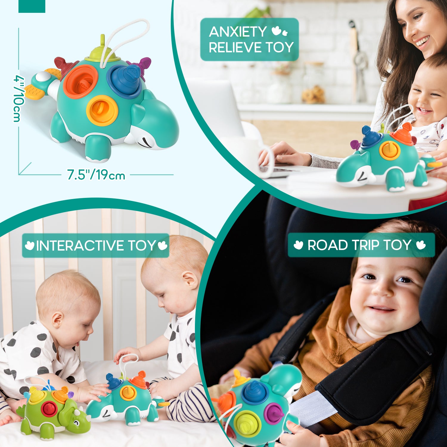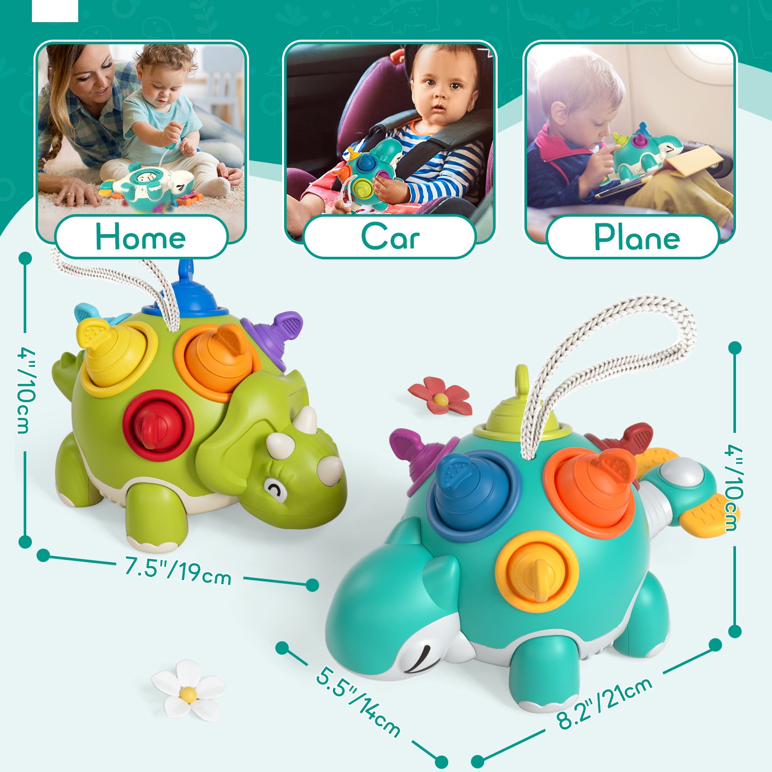 - Multifunctional Dinosaur Toys (NON-ELECTRONIC TOY): Colorful textured pop fidget, rotatable dinosaur egg and chassis, stretchable legs, crisp tail turning sound, unique dino shape... Keep your baby busy and happy! (This toddler toy neither requires/includes batteries nor rechargeable use)
