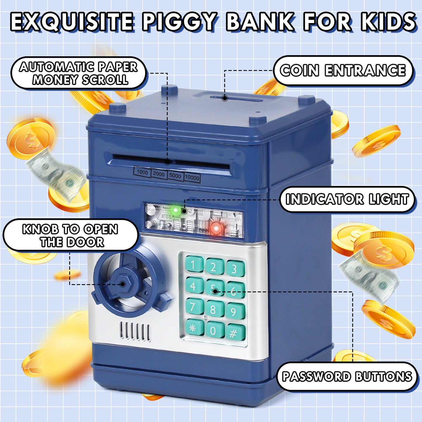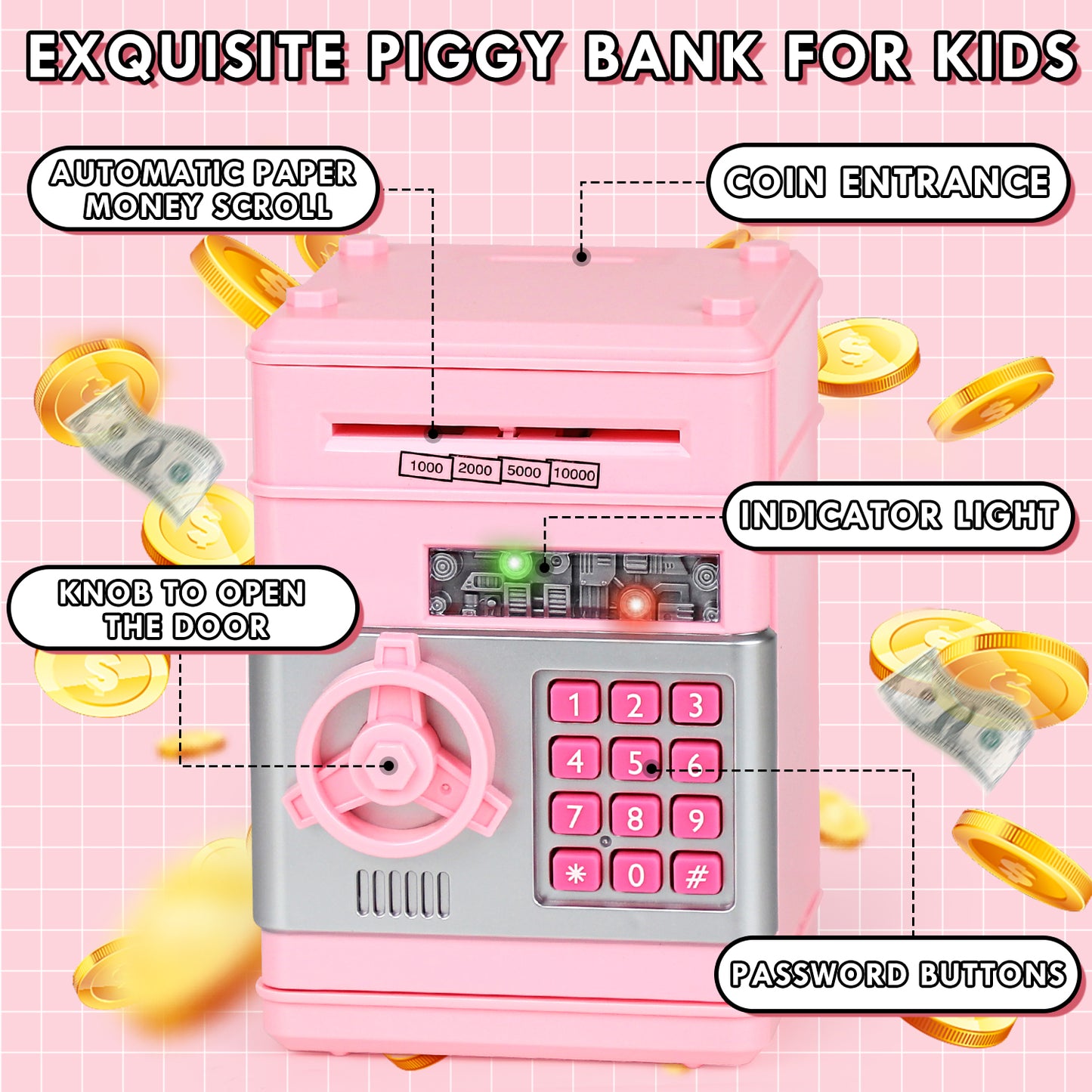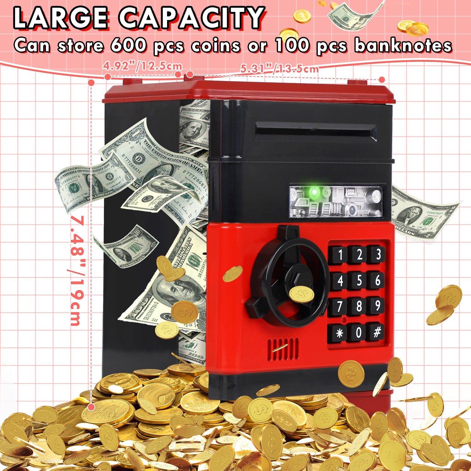 Tow Ways of Saving Money: Cash & CoinHigh-capacity Money Bank: 600 pieces of coins or 100 pieces of paper moneyTwo Sound Modes: BEEPS SOUND mode & VOICE modePassword ProtectionSound PromptAutomatic Paper Money ScrollLarge Storage Space