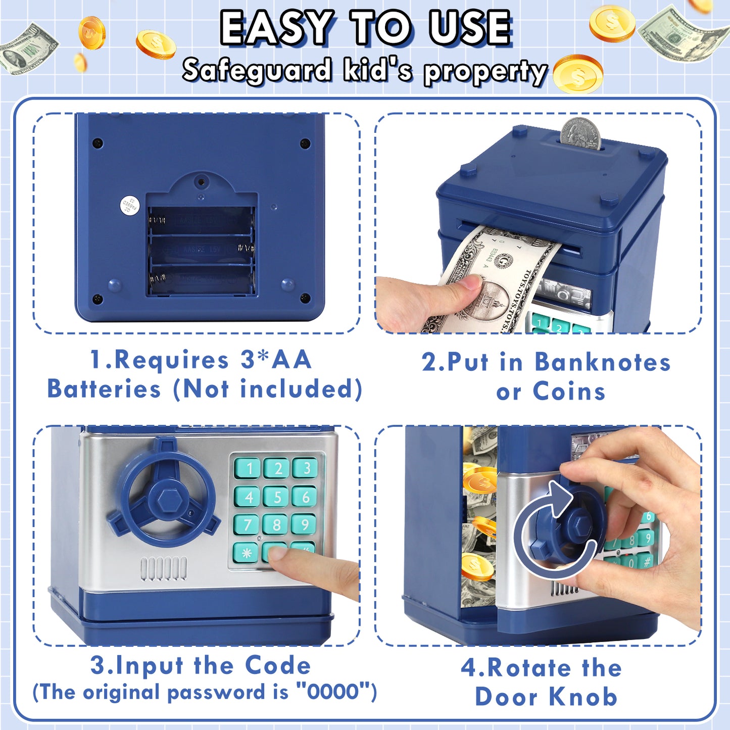 This piggy bank is made from environmental ABS plastic, ensuring it is safe, odorless, and highly durable. Designed specifically for children, it’s both interesting and sturdy, providing long-lasting use. (Requires 3 * 1.5V AA batteries, not included.)- 🔒 Secure Password Protection 🔒