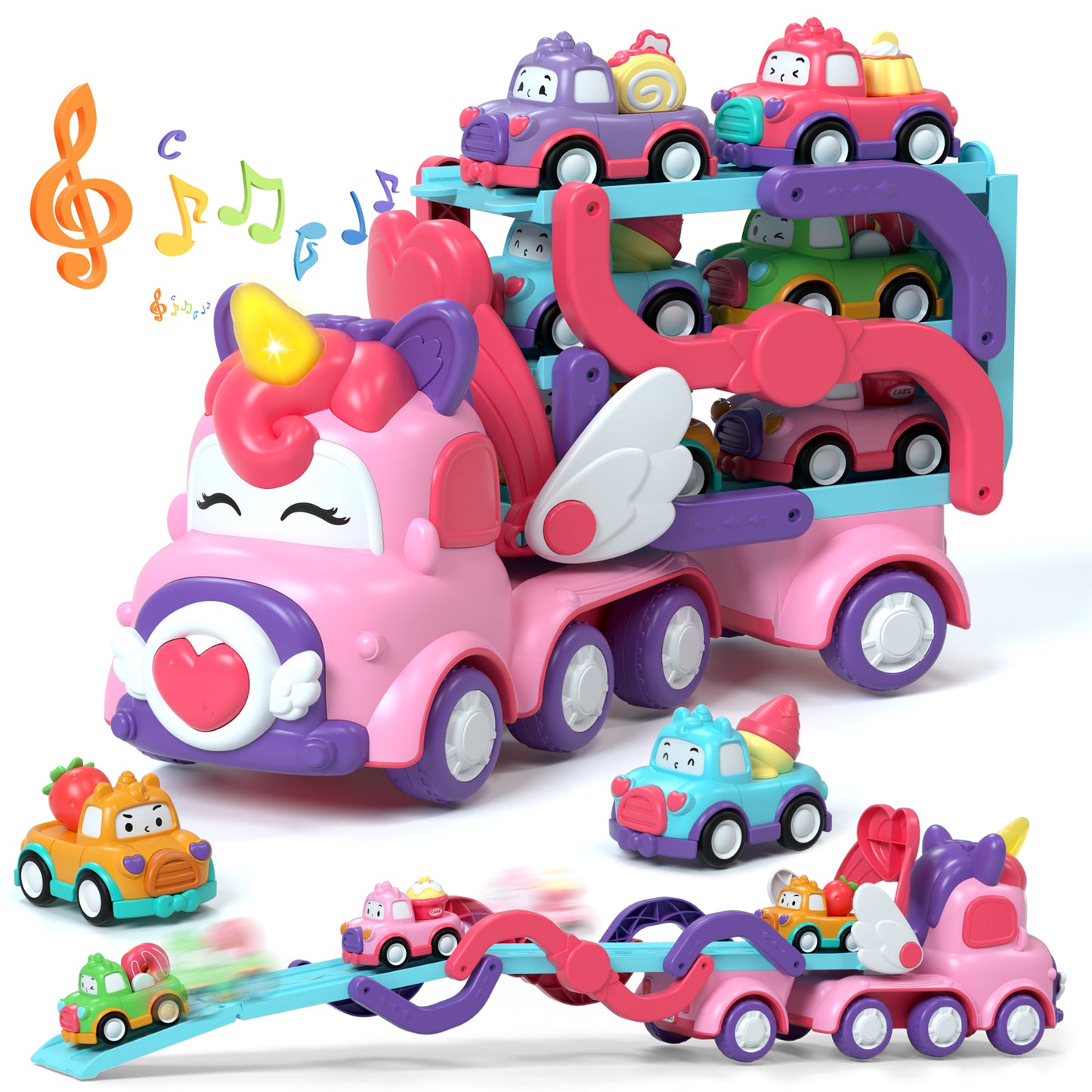 Toddler Girl Toys, 7-in-1 Toy Cars for Girls with Lights & Music, 2 Year Old Girl Toys, Unicorn Toys, Car Carrier Truck Toy, Toys for 1 2 3 Year Old Girls