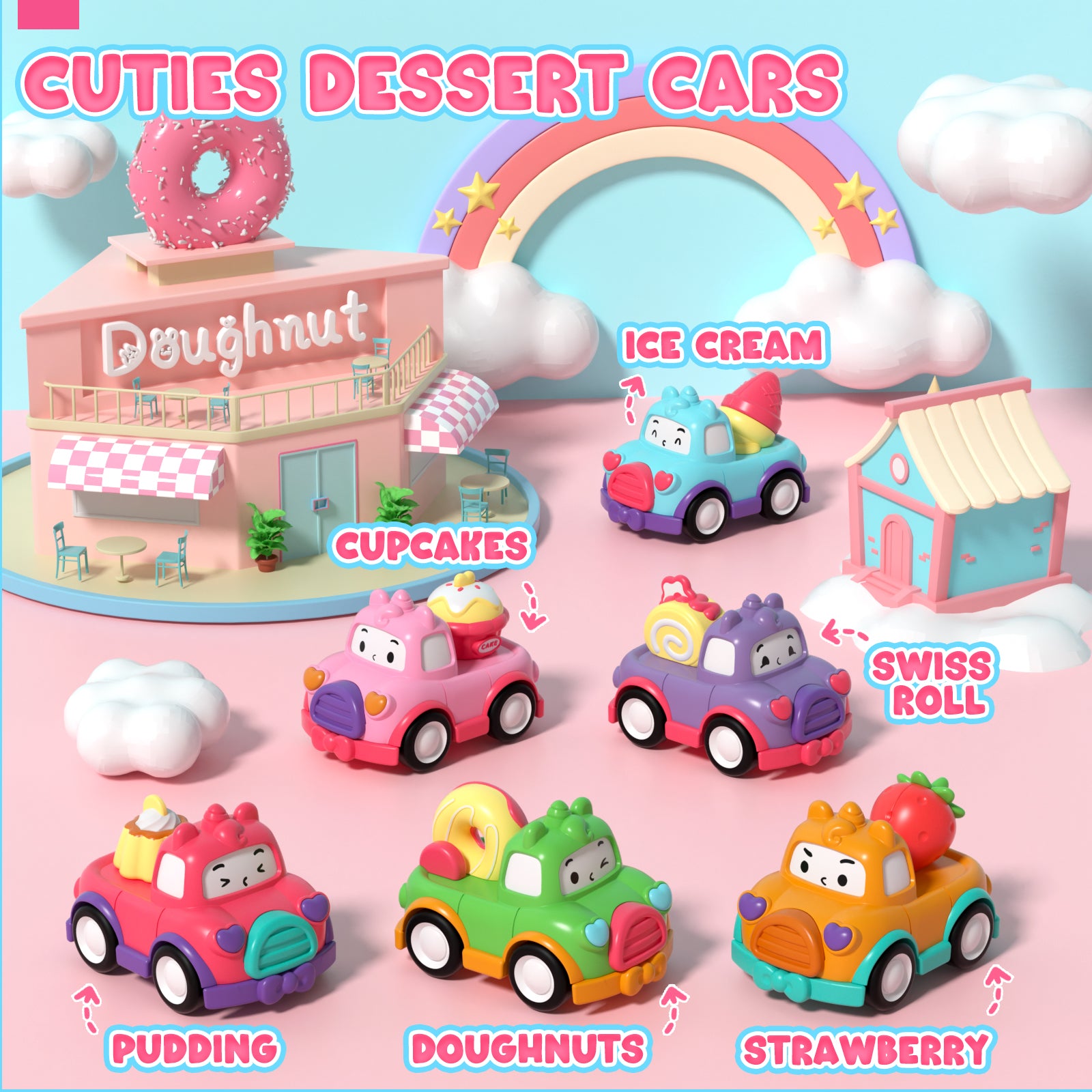 - 4. Sweet Storage for Organization: The set comes with a compact dessert-themed storage case that keeps all six toy cars neatly organized. This adorable carrying case adds a touch of charm while encouraging toddlers to develop tidying habits early on.