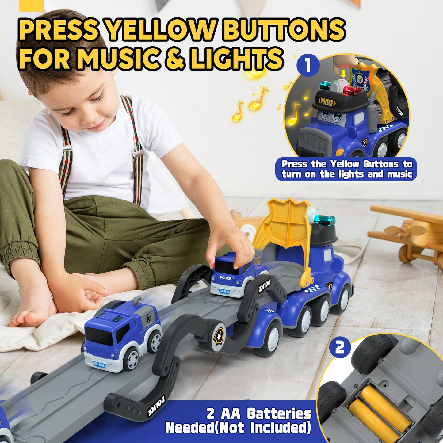 Toddler Toy for 2 3 4 5 Year Old Boys, Police Truck Toy Car with Light & Siren, 3 Layer Toy Truck Car Set with 6 Pull Back Cars & Race Track, Best Birthday Gifts for Age 2-5 Boys
