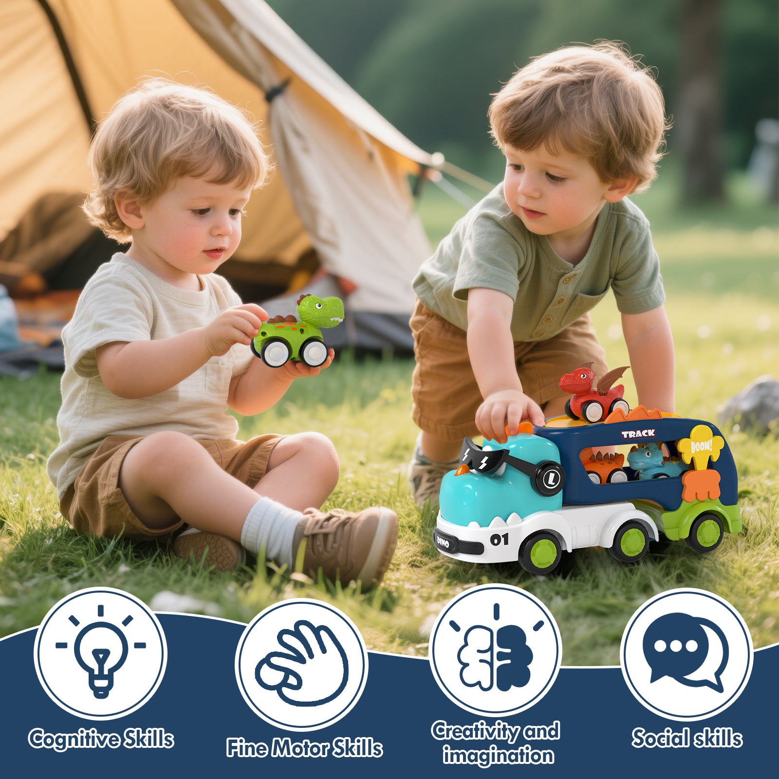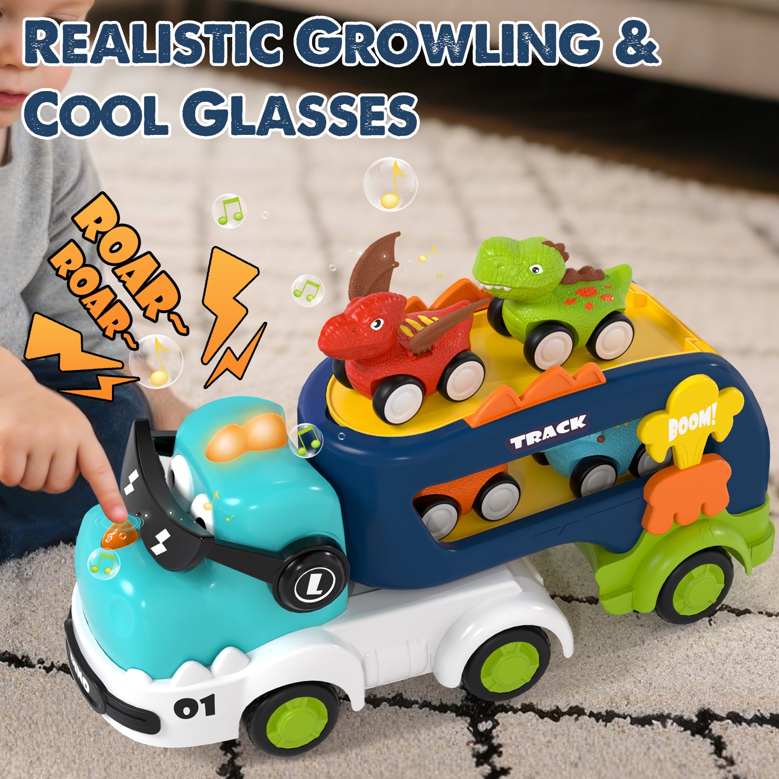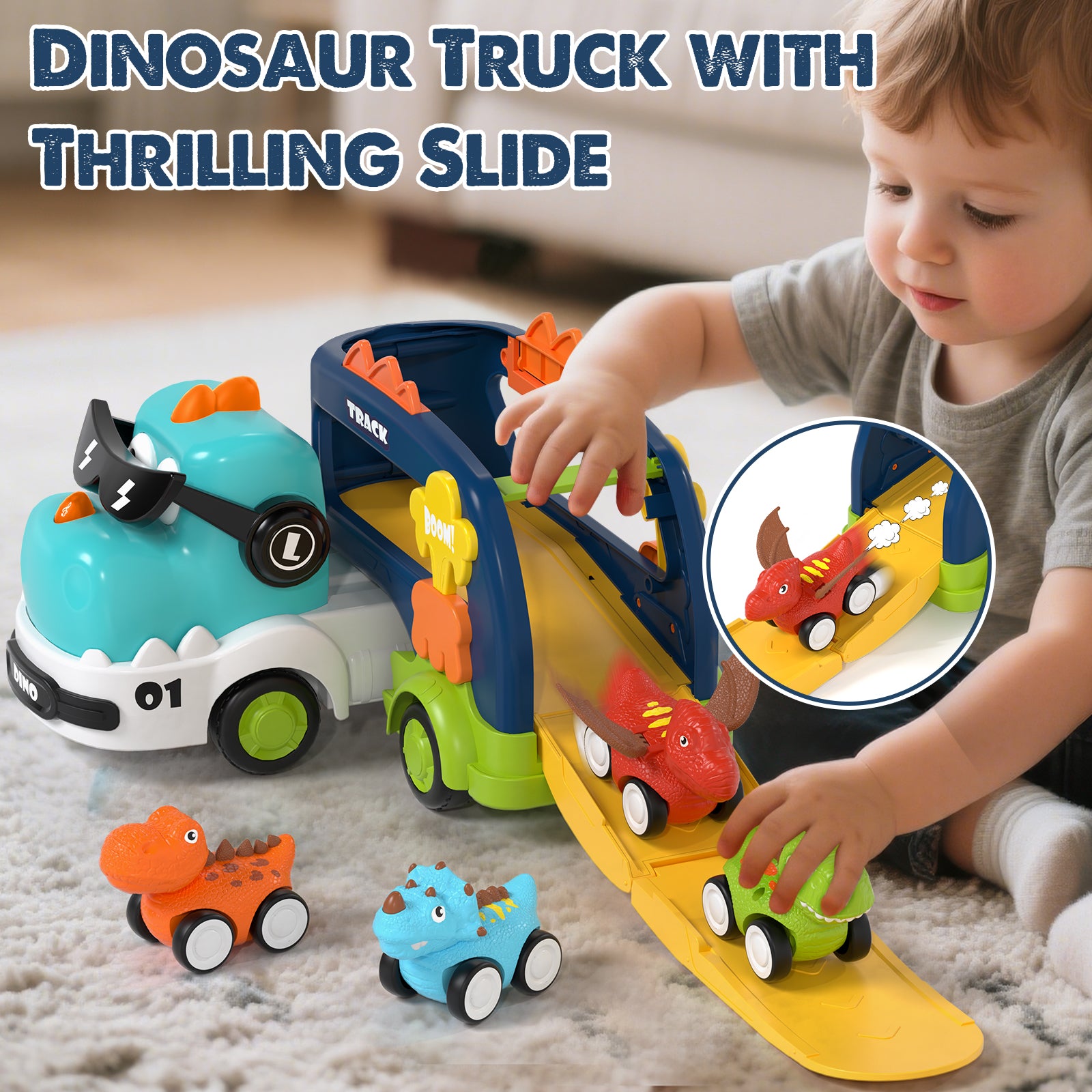 - Rich Vehicle & Dinosaur Set ? Includes a large dinosaur transport truck and 4 pull-back mini dinosaur cars. Unique dinosaur shapes, bright colors, and playful features like a rotating head with sounds make this set an exciting choice for toddlers who love cars and dinosaurs.